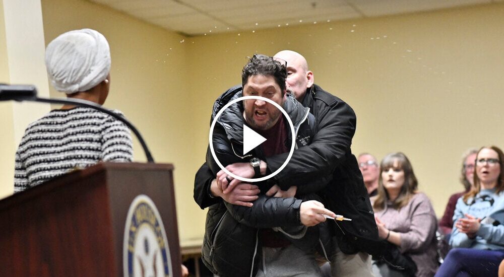 new video loaded: Man Lunges at Ilhan Omar During Minneapolis Town Hall transcript Back transcript Man Lunges at Ilhan Omar During Minneapolis Town Hall During a...