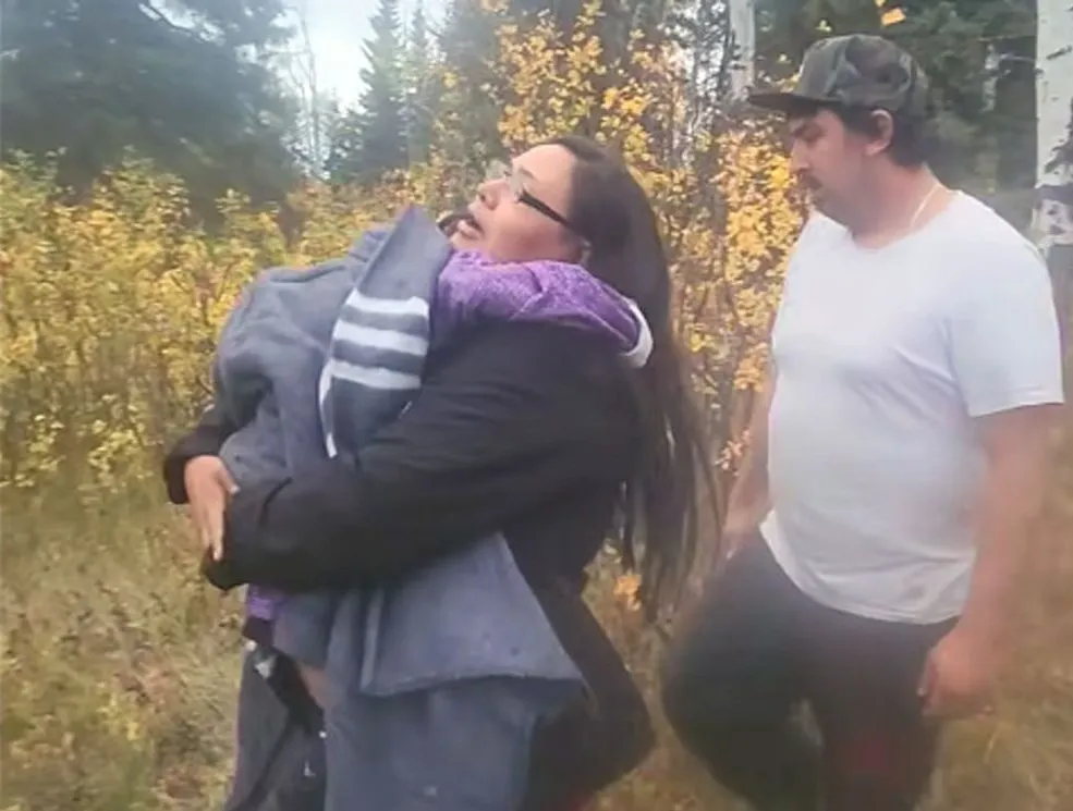 . The video shows Oaklynn’s mother, Gail Skin, and others rushing into the forested area as Schweder is found.