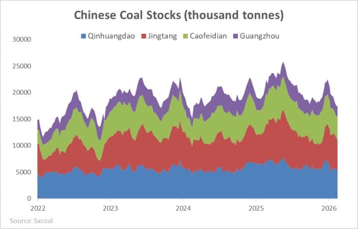 Overall, China’s coal production remains robust, reaching roughly 440 million tonnes per month in December 2025. Imports, although down from the record 427 million tonnes in 2024 to 373.5 million tonnes in 2025, remain far above the pre-2022 average of about 260 million tonnes annually. At the same time, coal exports declined slightly to 13.9 million tonnes, and domestic inventories fell sharply in the second half of 2025, from 25 million tonnes to around 18 million tonnes. The decline in coal-fired electricity generation, combined with falling inventories and exports, implies that coal consumption is not falling as quickly as power sector data suggests. The question, then, is where the displaced coal is going?